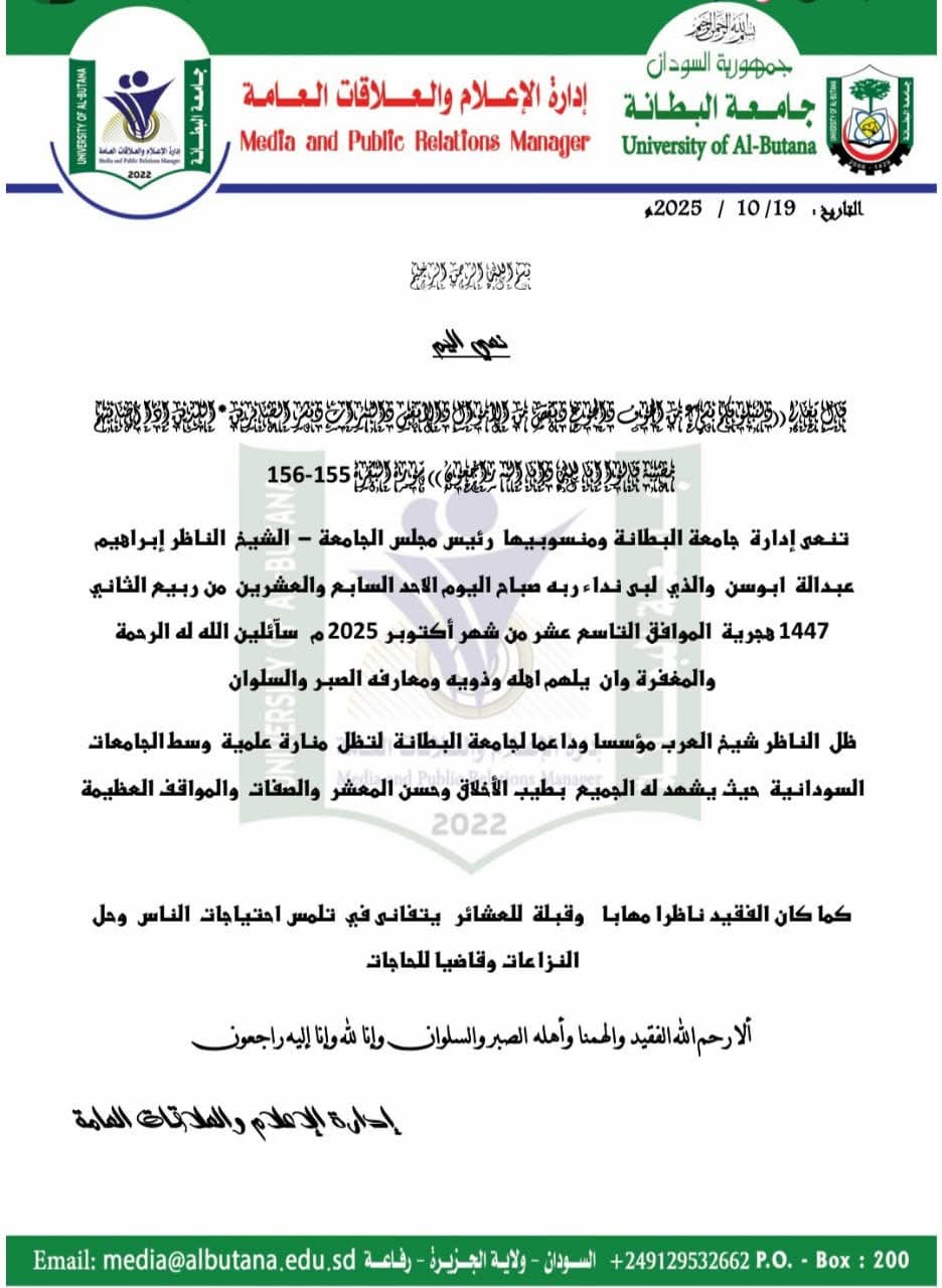 انا لله وانا اليه راجعون .. وفاة رئيس مجلس الجامعة المرحوم بإذن الله شيخ العرب الناظر ابراهيم ابوسن