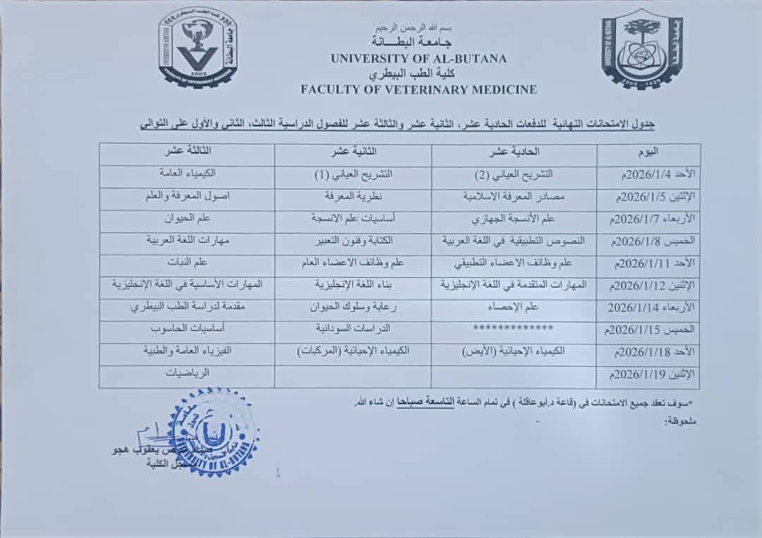 جدول امتحان الدفعات المختلفة بكلية الطب البيطري بتمبول