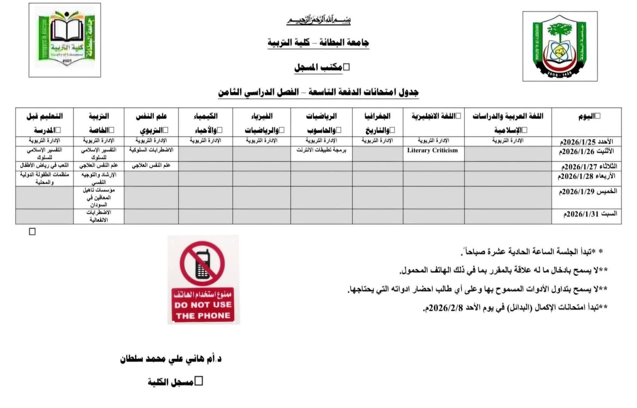جدول امتحانات الدفعات بكلية التربية